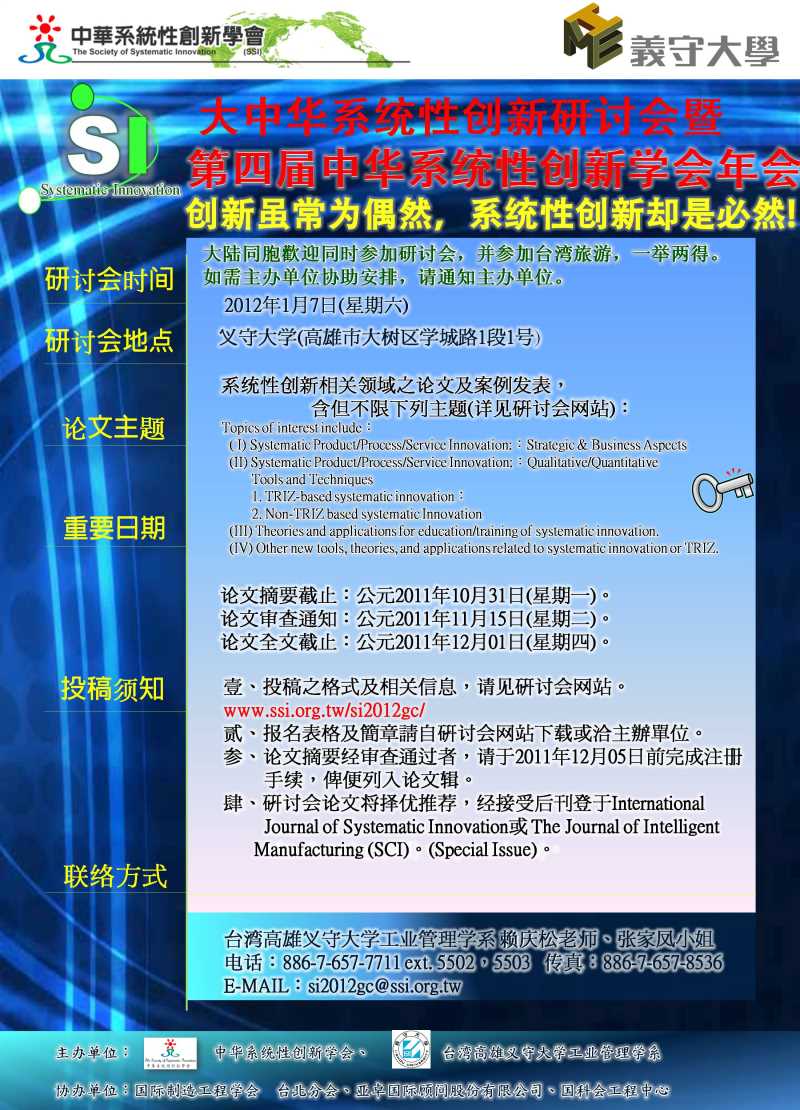 中华系统性创新学会与义守大学工业工程与管理学系将于2012年1月7日(星期六)假高雄义守大学举行「2012大中华系统性创新研讨会暨第四届中华系统性创新学会年会」,竭诚邀请各界学者专家参与此次研讨会,并诚挚地向您邀稿,期盼惠赐大作。
