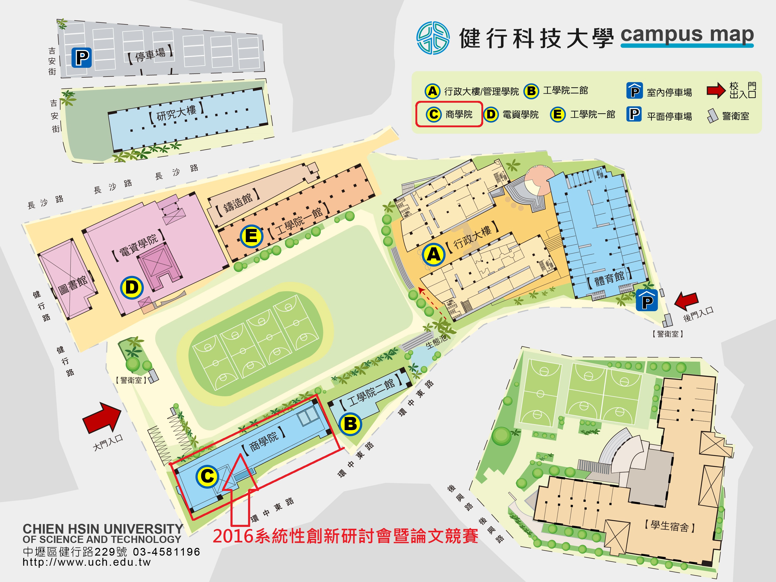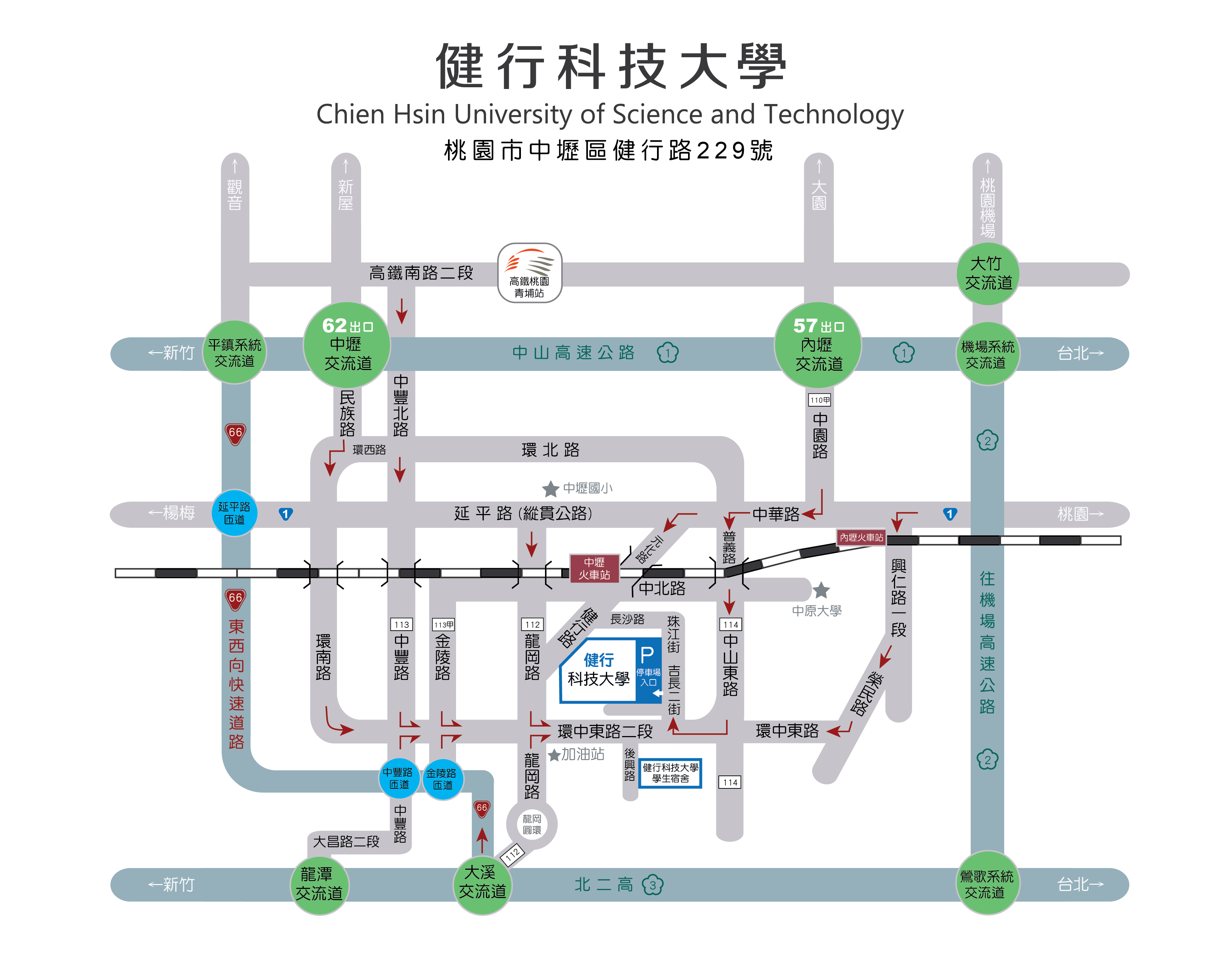 到達健行科技大學交通方式: 地址:32097桃園市中壢區健行路229號 ‧搭火車: 【國道一號】北上經中山高:請於中壢交流道(62.4K)下高速公路,往中壢方向行駛,行經民族路→(右轉)環南路→(直行)環中東路→(左轉)龍岡路→(直行)健行路抵達本校。 【經北二高(南下)】:請於大溪交流道(62.7K)下高速公路,往中壢方向行駛→(左轉)上大溪至觀音66號快速道路→於中豐路交流道下快速道路→(右轉)中豐路(往中壢方向)→(右轉)環南路→(直行)環中東路→(左轉)龍岡路→(直行)健行路抵達本校。 【經北二高(北上)】:請於大溪交流道(62.7K)下高速公路,往中壢方向行駛→(左轉)上大溪至觀音66號快速道路→於中豐路交流道下快速道路→(右轉)中豐路(往中壢方向)→(右轉)環南路→(直行)環中東路→(左轉)龍岡路→(直行)健行路抵達本校。