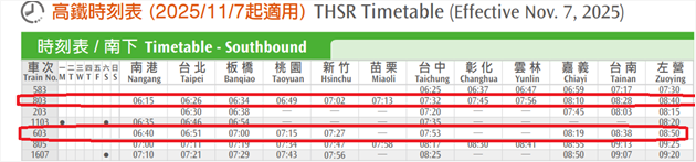 - *班次603抵達左營高鐵時間8:50 。